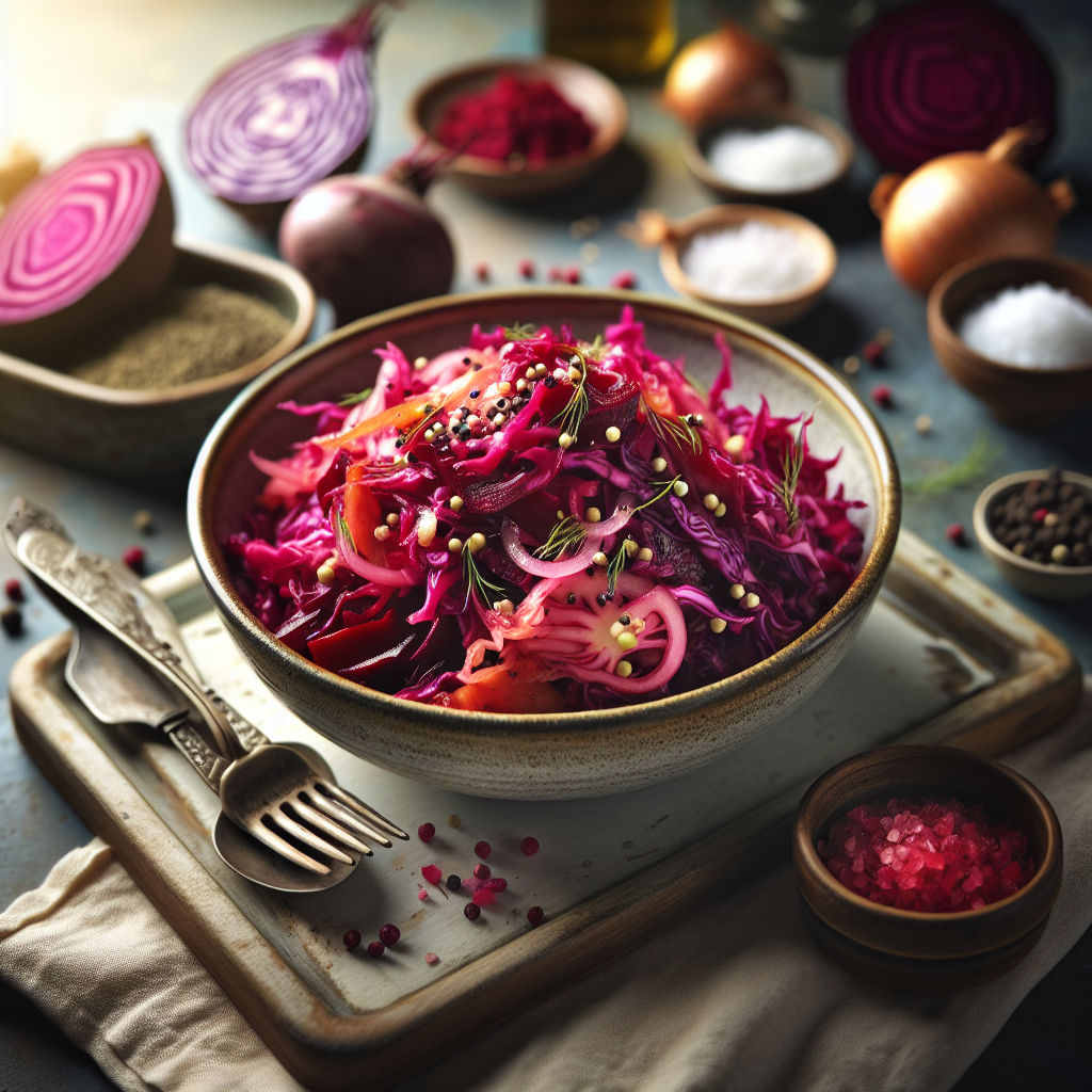 - In a large bowl, combine beetroot, red cabbage, onion, and caraway seeds. Add 1 to 1½ teaspoons of freshly ground black pepper, and mix thoroughly using your hands for about 5 minutes. Wearing gloves is recommended to prevent staining from the beetroot.