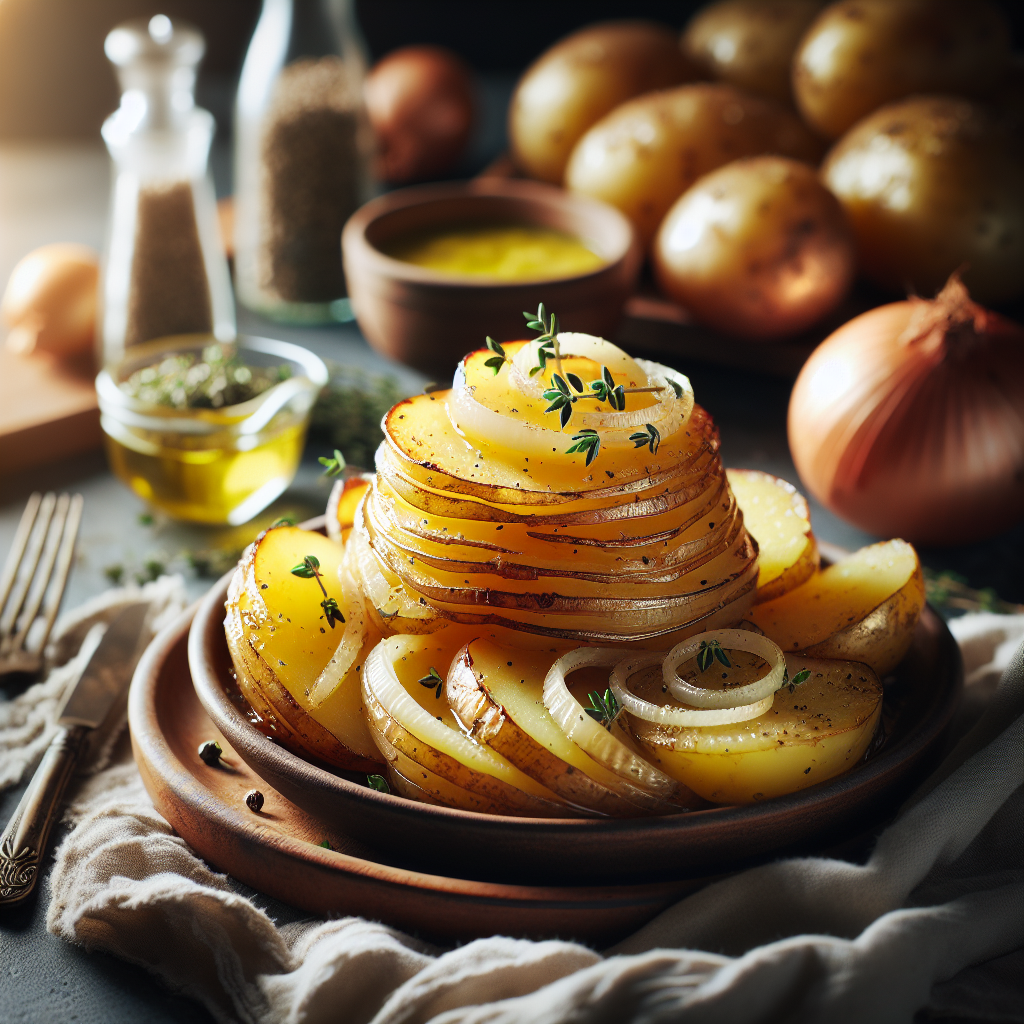 - In a greased 1.5-liter gratin dish, lay down a layer of 1.5 kg of potatoes, then sprinkle a portion of the sautéed onions on top. Repeat the layering process, finishing with a final layer of potatoes.