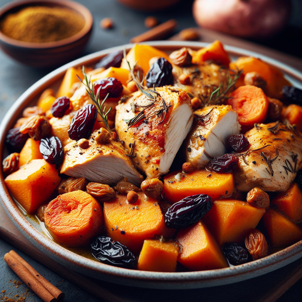 A flavorful Algerian dish combining tender chicken thighs, sweet potatoes, and aromatic spices, baked to perfection with raisins and prunes.