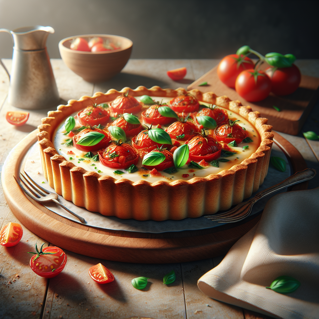 - Assemble: Once the tart is baked, use a spoon to arrange the marinated tomato slices on top, being careful to leave excess liquid behind. Garnish with fresh basil leaves before serving.