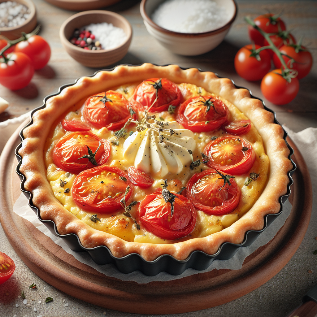 - Once the tart is baked, spoon the marinated tomato slices over the top, avoiding excess liquid. Garnish with fresh basil leaves and serve.