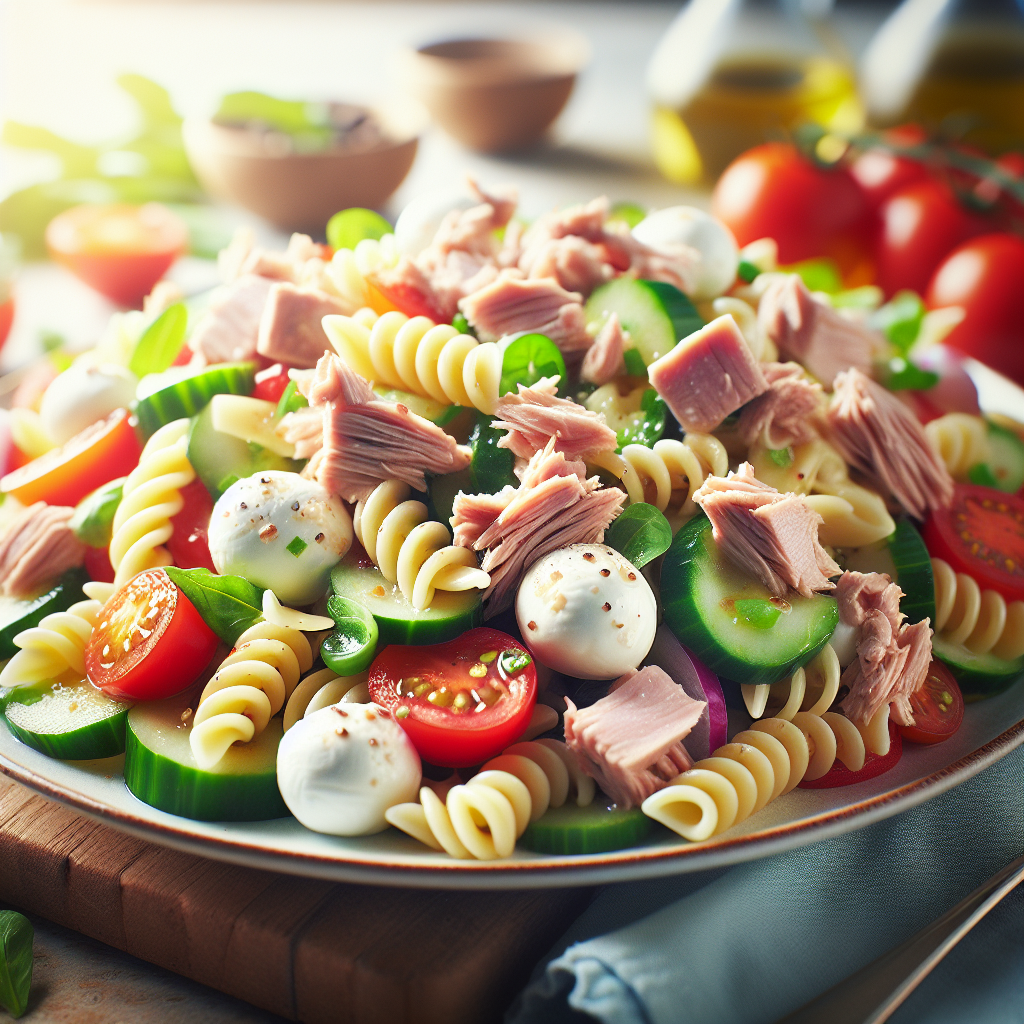 - Incorporate the sliced olives, mozzarella balls, and chunks of tuna. Mix everything together thoroughly.