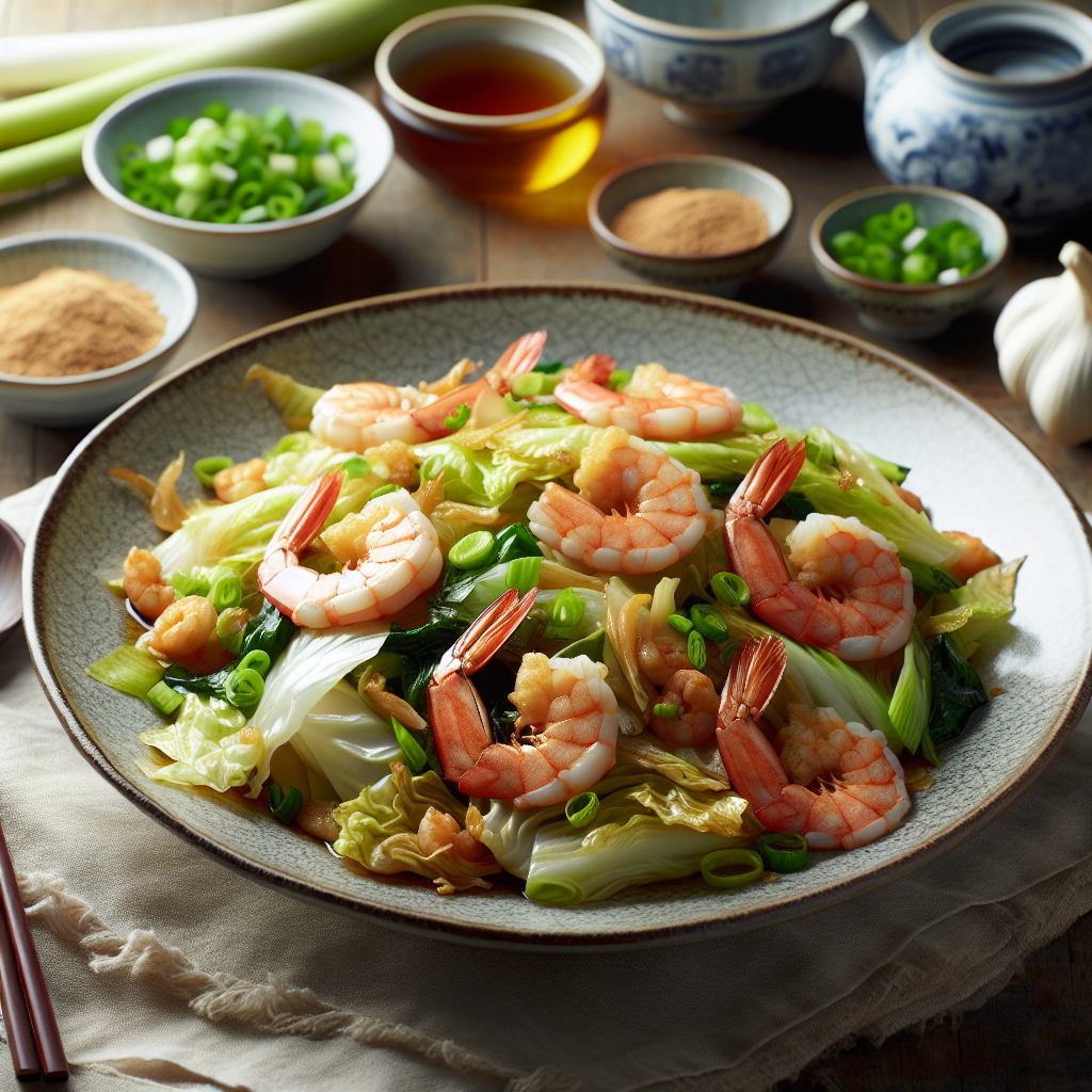 - Cook the shrimp and cabbage: Heat 2 tablespoons of peanut oil in a large wok or skillet over high heat. Once shimmering, add 4 chopped scallions, 1 tablespoon of ginger, and the drained shrimp. Stir-fry for about 1 minute until fragrant.