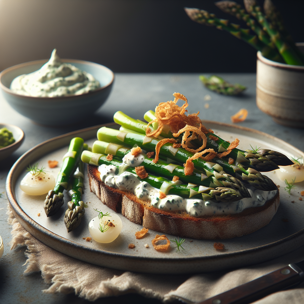 - Assemble the smørrebrød by placing the grilled slices of bread on serving plates. Arrange the blanched and raw asparagus on top. Drizzle with the prepared horseradish cream, sprinkle over the västerbottensost cheese, and finish with the crispy shallots and a sprinkle of dill for garnish.